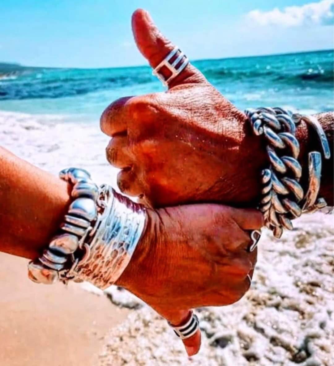 Quel che piace delle creazioni di Tito è che con lui l’argento non solo prende vita. Diventa anche un frammento dell’anima di questa isola meravigliosa, intriso della sua magia e della sua bellezza. Le sue mani esperte, le sue tecniche raffinate, la sua cura dei dettagli e la sua dedizione, trasformano il metallo in gioielli che racchiudono quello spirito magico (un po’ hippie, un po’ anticonformista e un po’ speciale) di Formentera. Ed ecco il perché le sue creazioni ispirate alla natura selvaggia, al mare e al corpo umano sono diventate oramai delle vere e proprie icone di stile. Immortali. Già, perché Tito non segue le mode effimere, ma crea pezzi che non hanno tempo, destinati a durare per sempre e a diventare parte della storia di chi li indossa. Da sempre i suoi gioielli danno veramente un qualcosa di identificativo e distintivo. Quello che, insomma, rende il lavoro di Tito così speciale non è solo il pregio dei materiali, ma è la sua capacità di infondere personalità in ogni creazione. Che si tratti di un anello che evoca le onde del mare, un bracciale che richiama le forme sinuose delle dune o una collana che cattura la luce dei tramonti di Formentera, i gioielli di Tito sono da sempre unici, inconfondibile e inimitabili.