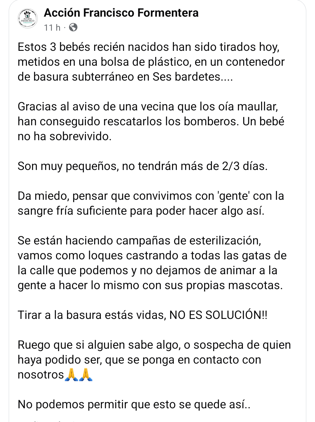 FORMENTERA (31 marzo 2025) – Sta suscitando rabbia e tanta tristezza la notizia resa nota ieri 30 marzo dall’ “Associazione Francisco Formentera” che si occupa dei gatti dell’isola senza padrone. Tre gattini nati da due o tre giorni sono stati abbandonati come rifiuti in uno dei cassonetti interrati dell’area ecologica di Ses Bardetes. A sentire il miagolio disperato dei gattini è stata una persona che era andata appunto a buttare via la spazzatura. Sono stati allertati subito i Vigili del fuoco che sono riusciti a recuperare i tre gattini, ma purtroppo uno era morto. I suoi due fratellini stanno abbastanza bene ma di certo hanno vissuto un incubo e ora, senza la loro mamma vicino, hanno bisogno di cure e amore.